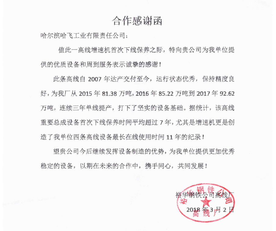 哈爾濱哈飛工業(yè)有限責(zé)任公司旗下的機(jī)電設(shè)備制造產(chǎn)業(yè)是目前國內(nèi)規(guī)模大、專業(yè)的高速線材軋機(jī)和棒材軋機(jī)整機(jī)及備件的生產(chǎn)制造企業(yè)。公司現(xiàn)坐落于哈爾濱市平房區(qū)汽車零部件工業(yè)園B區(qū),占地面積30000多平方米。現(xiàn)有員工近550人,其中具有中高級(jí)職稱的研發(fā)及工程技術(shù)人員100余人。   公司曾獲得冶金部授予的“高線軋機(jī)設(shè)備優(yōu)單位”稱號(hào)、國家技術(shù)進(jìn)步二等獎(jiǎng)等獎(jiǎng)項(xiàng),公司生產(chǎn)的十八項(xiàng)高線軋機(jī)重要部件通過了技術(shù)鑒定... +MORE